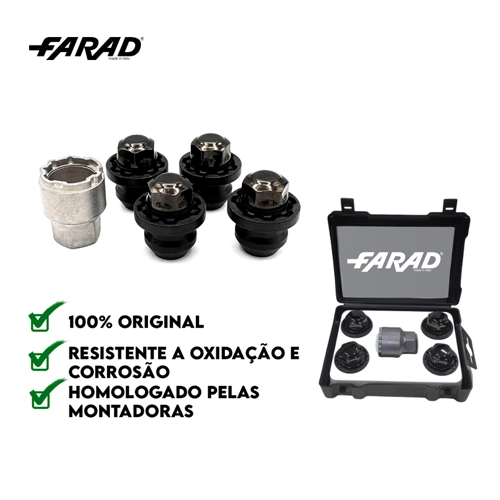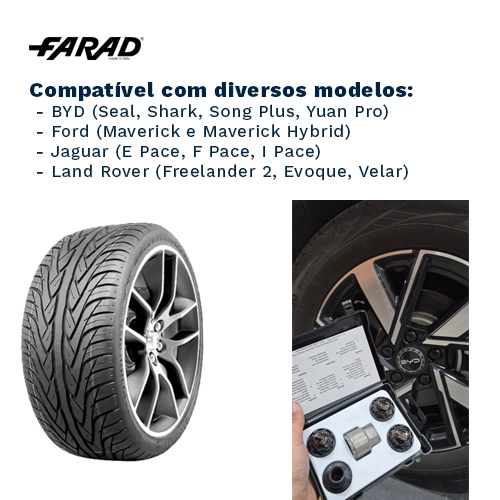 Compatível com diversos modelos de BYD (Seal, Shark, Song Plus, Yuan Pro), Ford (Maverick e Maverick Hybrid), Jaguar (E Pace, F Pace, I Pace) e Land Rover (Freelander 2, Evoque, Velar), o antifurto FARAD garante proteção sem comprometer o design das rodas.