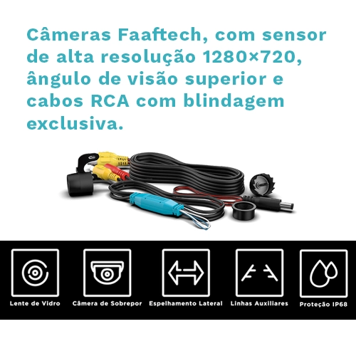 Além disso, a Câmera de Ré Faaftech conta com vedação IP67 (à prova d’água) e amplo ângulo de visão, garantindo segurança e praticidade nas manobras, tanto de dia quanto à noite.