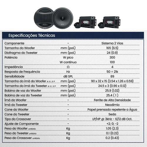 O kit é composto por alto-falantes de 6,5 polegadas (6×5″) para reprodução de médios e graves consistentes, além de tweeters dedicados com tela protetora, garantindo agudos mais nítidos e detalhados. O conjunto 2 vias permite melhor separação de frequências, oferecendo maior qualidade sonora e fidelidade musical.
