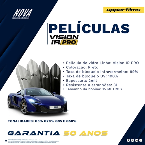 Película de vidro automotivo Upperfilms Vision IR Pro tecnologia que você enxerga, proteção que você sente. Cinquenta anos de garantia certificada.