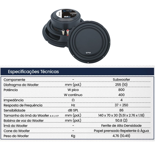 - 1 Subwoofer 10 Polegadas Relm Áudio 800 W 4 Ohms Symphony RS104 SB Bobina Simples